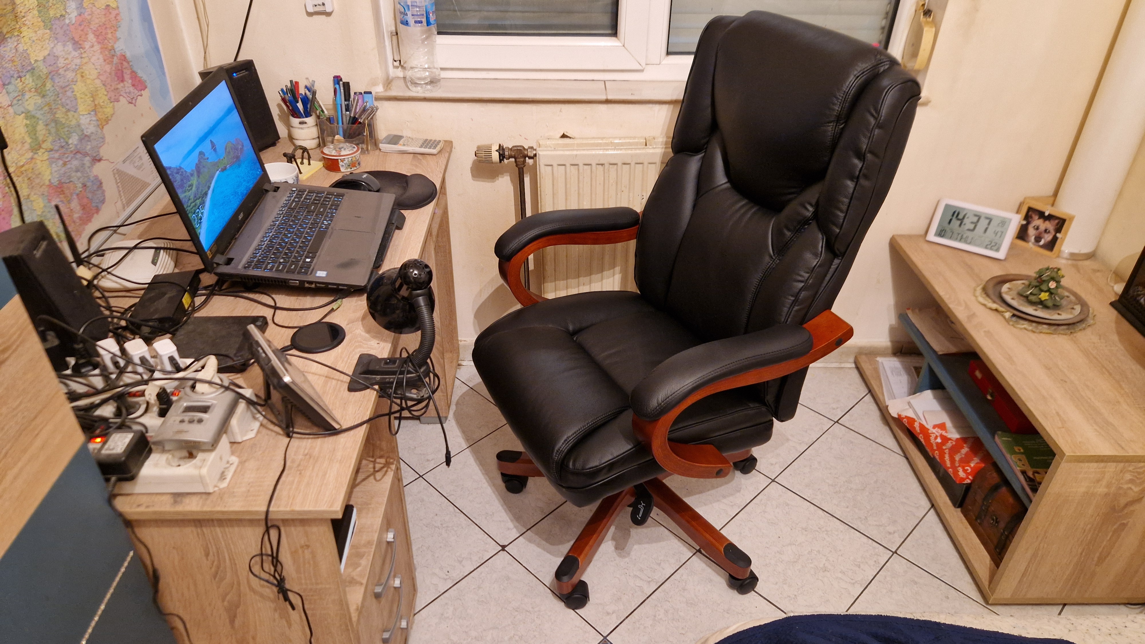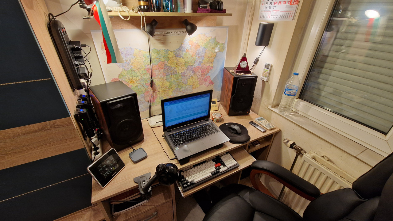 И от бюрото разкарах всички възможни кабели, стегнал съм ги на сноп зад него (което беше looooong overdue от памтивека насам, страшен бардак беше станал – преди и след). Останаха само аудио жакът и тухличката със зарядното на лаптопа, но догодина, че много скъп рамът напоследък, като си взема настолна машина, щото ми писна от този малък екран – и те ще изчезнат отзад в небитието.
